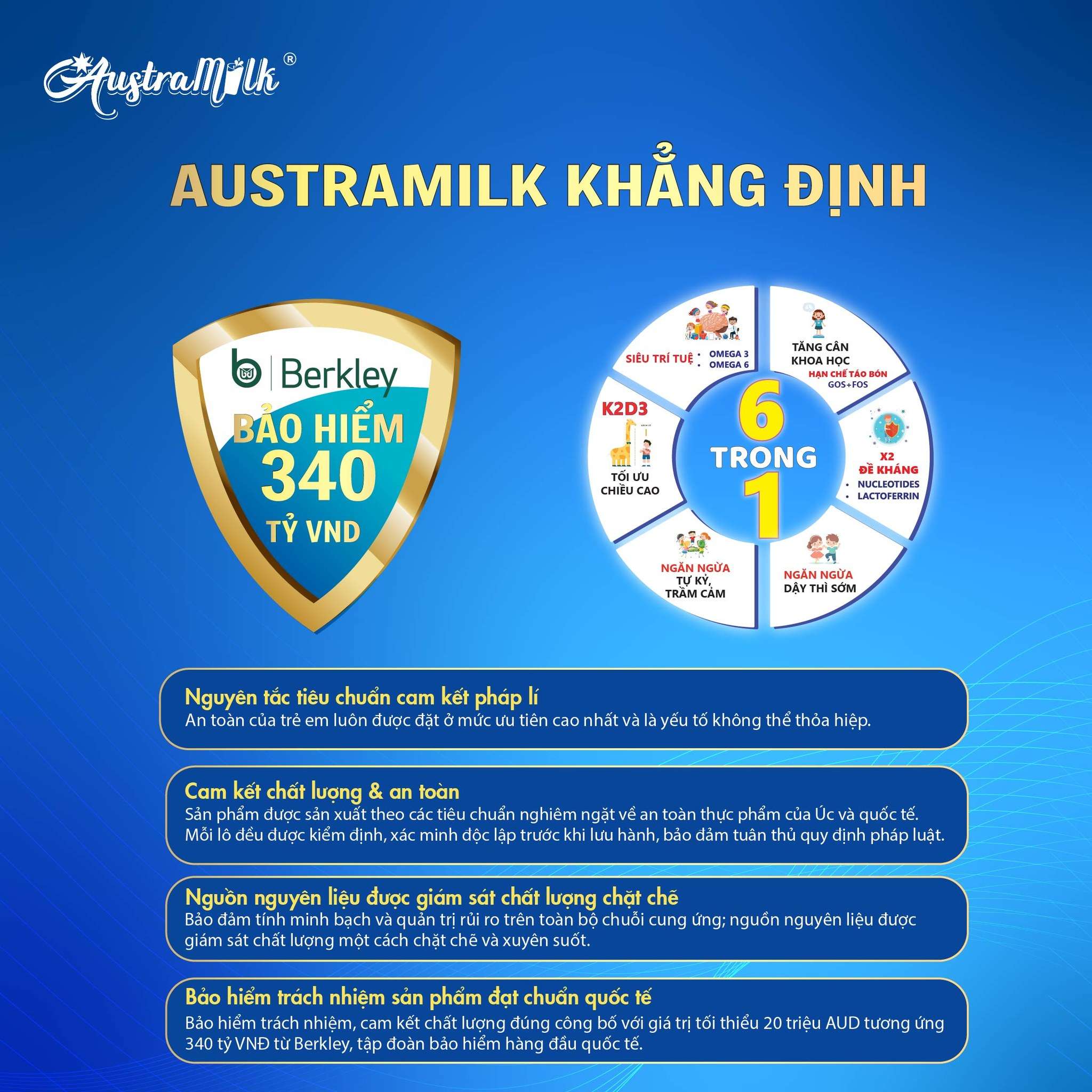 Với quan điểm lấy sự minh bạch và trách nhiệm làm kim chỉ nam giữa thị trường dinh dưỡng đầy biến động hiện nay. Austramilk đã khẳng định nền tảng pháp lý vững chắc và quy trình sản xuất nghiêm ngặt tại Australia. Sản phẩm tự hào mang đến công thức 6 trong 1 tối ưu cho sự phát triển của trẻ. Đặc biệt, niềm tin của người dùng được bảo chứng bằng gói bảo hiểm trách nhiệm sản phẩm trị giá 340 tỷ đồng (20 triệu đô Úc) từ tập đoàn Berkley danh tiếng. Đây không chỉ là một sản phẩm dinh dưỡng, mà là một lời cam kết thép cho tương lai vươn cao của thế hệ trẻ.